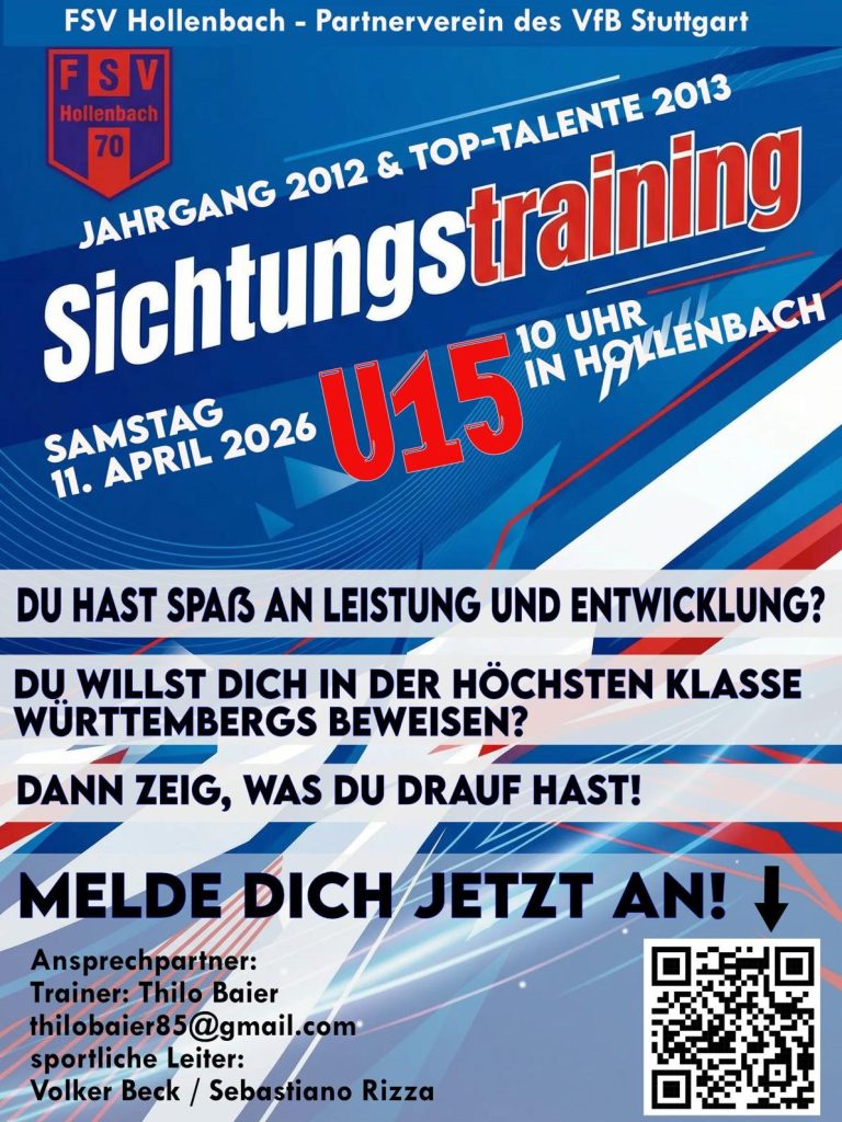 Der FSV Hollenbach lädt am 11.4.26 zum Sichtungstraining für die kommende U15 Saison ein. Scanne für eine Anmeldung den QR-Code oder kontaktiere direkt unsere Ansprechpartner.